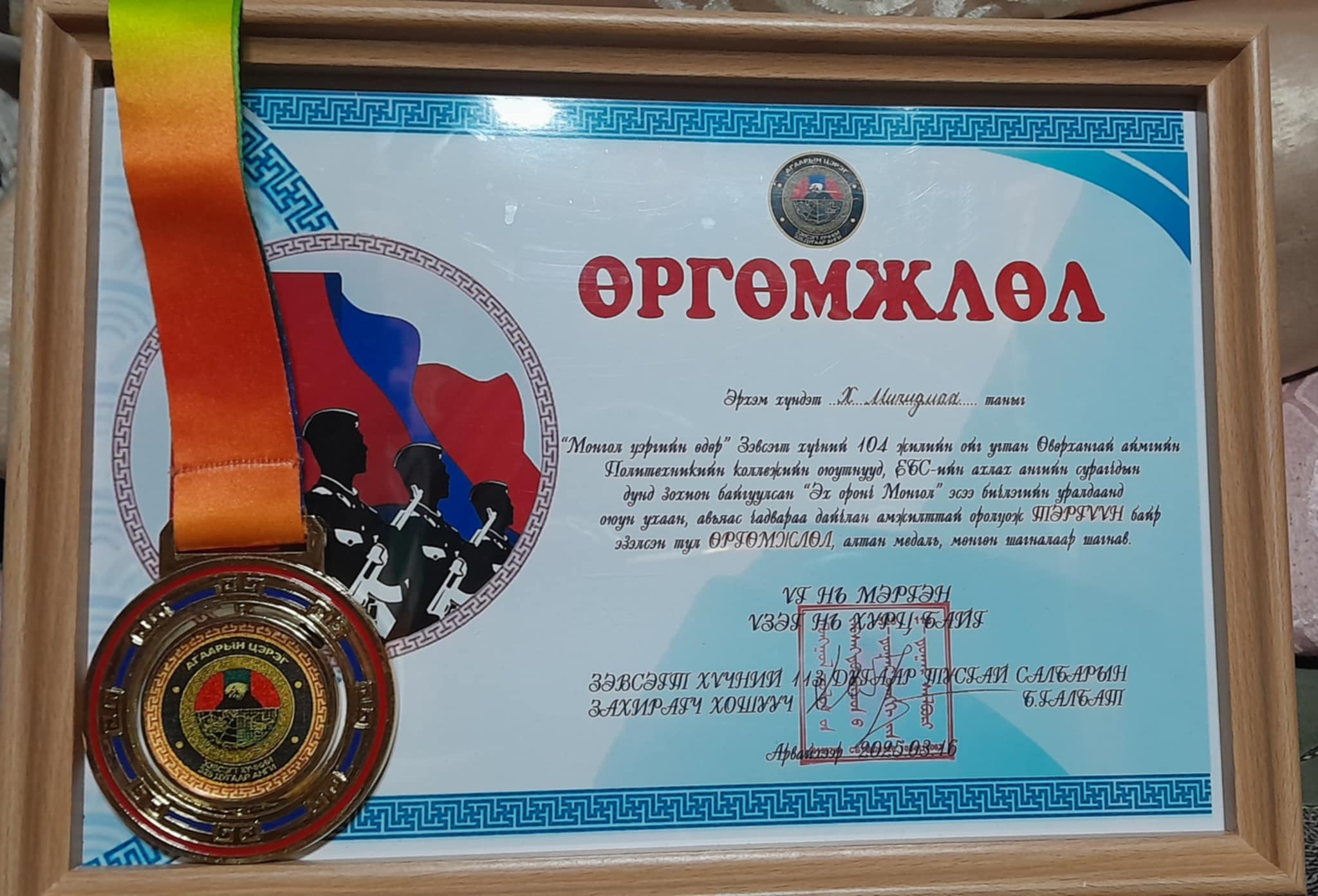"ЭХ ОРОНЧ МОНГОЛ" эсээ бичлэгийн уралдаанд 12в ангийн сурагч Х.Мичидмаа “ТЭРГҮҮН” байрт шалгарлаа.