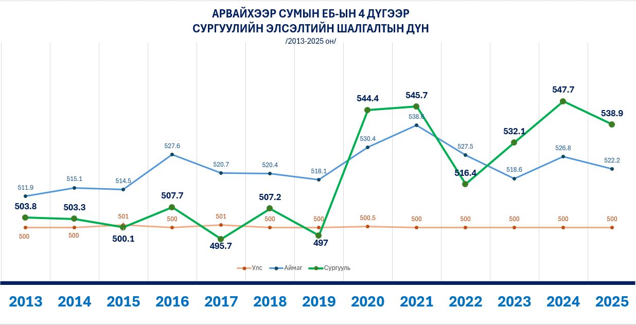 -Элсэлтийн шалгалт өгсөн 9 хичээлийн 7-д нь аймаг улсын дунджаас дээгүүр шалгадсан, сүүлийн 6 жилийн 5-д нь аймгийн дунджаас дээгүүр үнэлэгдсэн, жил бүр 800 оноотой сурагч шалгагдсан зэрэг онцлох амжилтыг үзүүллээ.